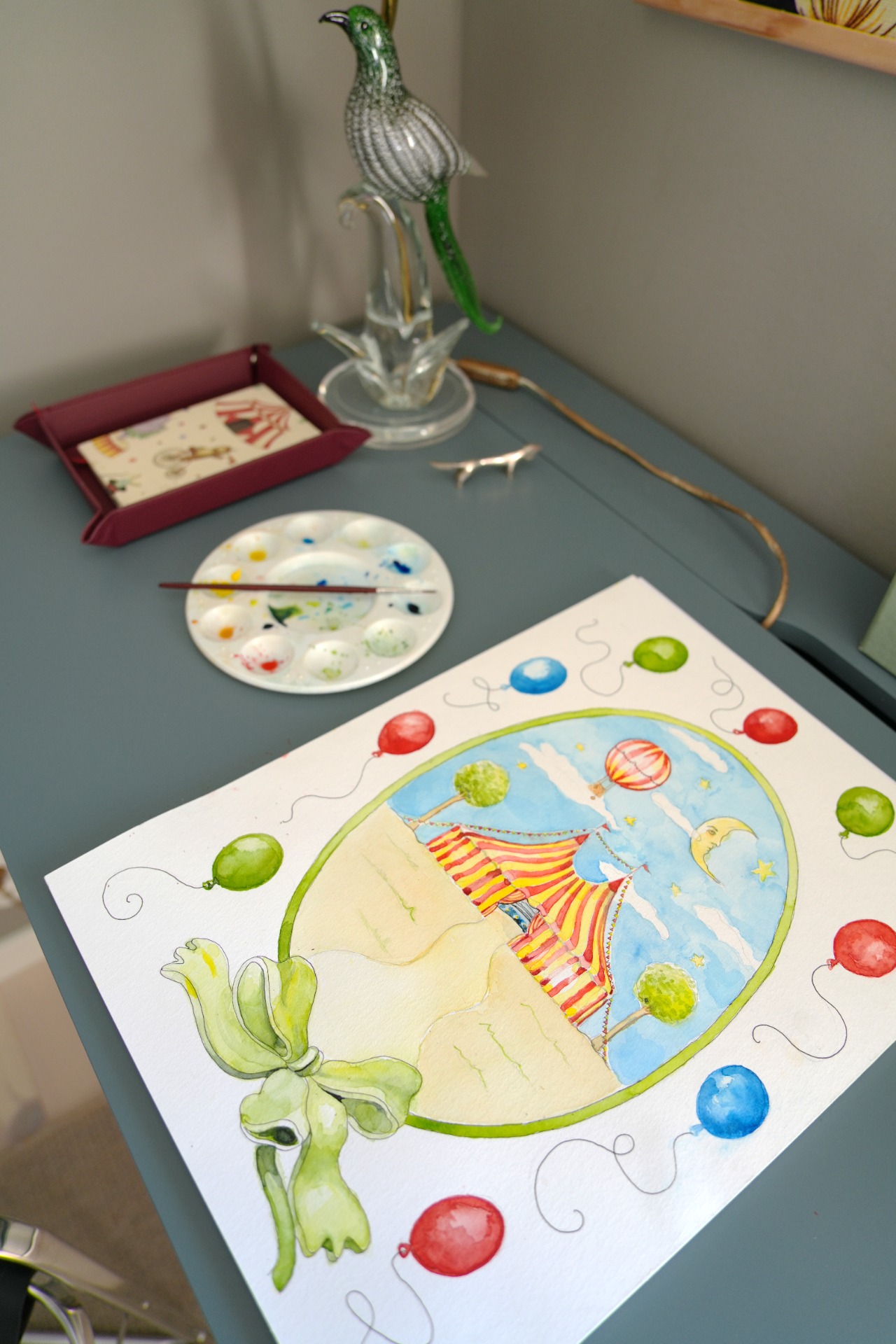 At the Circus är en ny kollektion med akvarellmålade motiv, inspirerad av cirkusens magiska och fantasifulla värld. Kollektionen består av sju charmiga och lekfulla motiv som fångar cirkuslivets livliga anda.